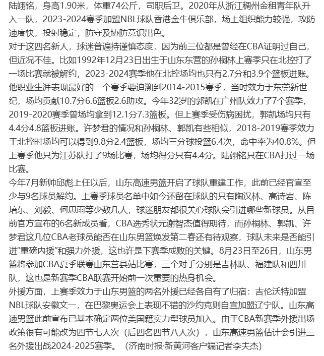 北京时间8月14日讯,根据@济南时报报道:邱彪上任后已签约6名新球员,山东男篮预计会引进三名外援出战新赛季。