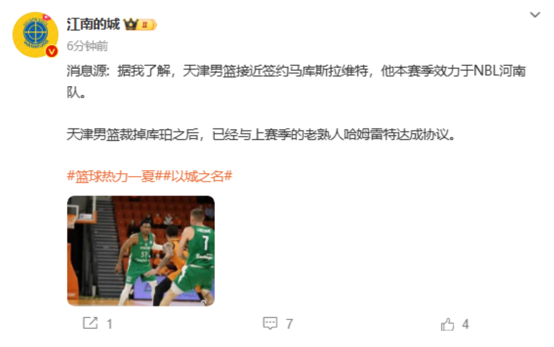 “江南的城”原文如下:消息源: 据我了解,天津男篮接近签约马库斯拉维特,他本赛季效力于NBL河南队。