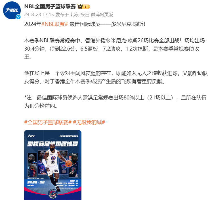 北京时间8月23日讯,根据NBL官方报道:常规赛最佳国际球员为多米尼克-琼斯。