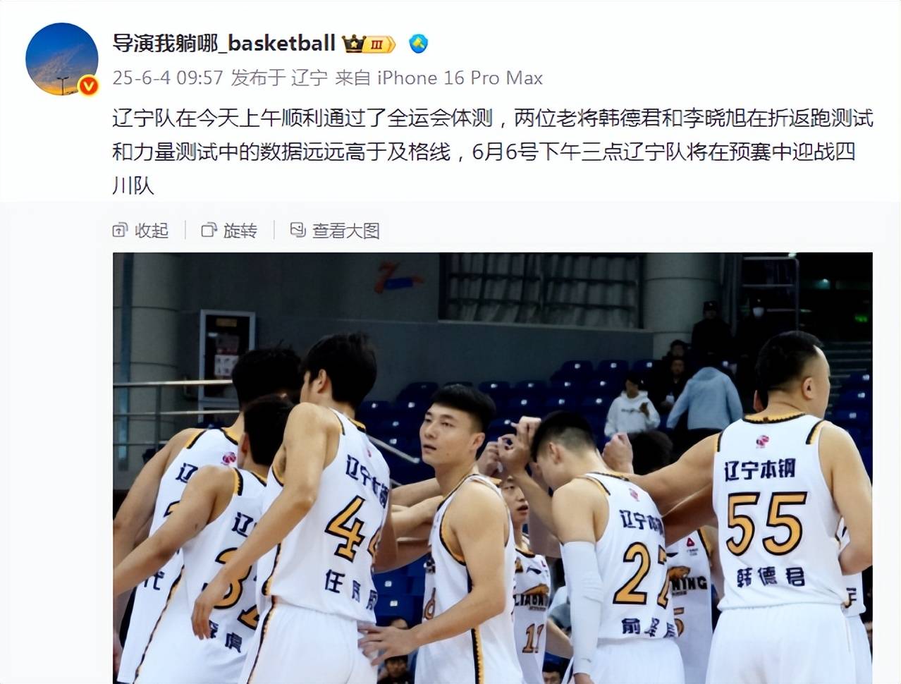 就在今天!6月4日上午,辽宁男篮传来韩德君李晓旭威尔斯新消息