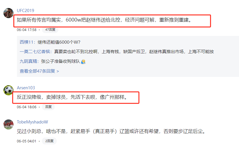 不过,也有球迷给出了建议,比如卖掉球员先活下去,像广州那样操作;还有球迷认为可以以6000万把赵继伟送给北控,经济问题可解,重新推倒重建。