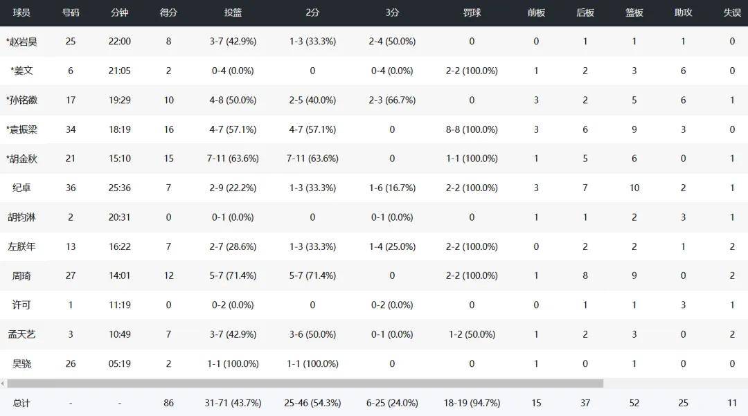 周琦14分钟里贡献12分9板准两双,孙铭徽10分5板6助,胡金秋15分6板。