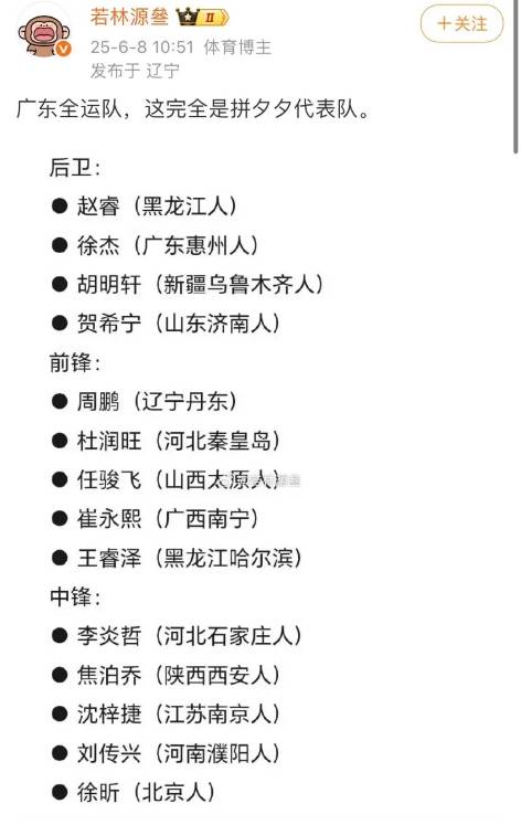 值得一提的是,该媒体人将广东队这些球员的籍贯都列了出来,并嘲讽广东队是“拼夕夕代表队”。该媒体人的意思非常明显,就是嘲讽广东队里几乎没有广东人(只有徐杰一人是广东人)。正常情况下,各省派出的全运会队伍,基本上都是以家乡子弟兵为主,像广东队这样全队只有一名广东人的情况并不多见。不过实话实说,广东队的这套阵容非常恐怖,基本上都是现役国手或者前国手,阵容非常深厚,战斗力非常强。也正是因为球队的实力强劲,主教练杜锋才会有底气喊出要带领球队夺冠的目标。
