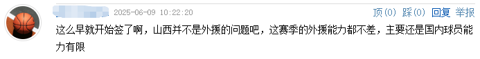 “这么早就开始签了啊,山西并不是外援的问题吧,这赛季的外援能力都不差,主要还是国内球员能力有限”