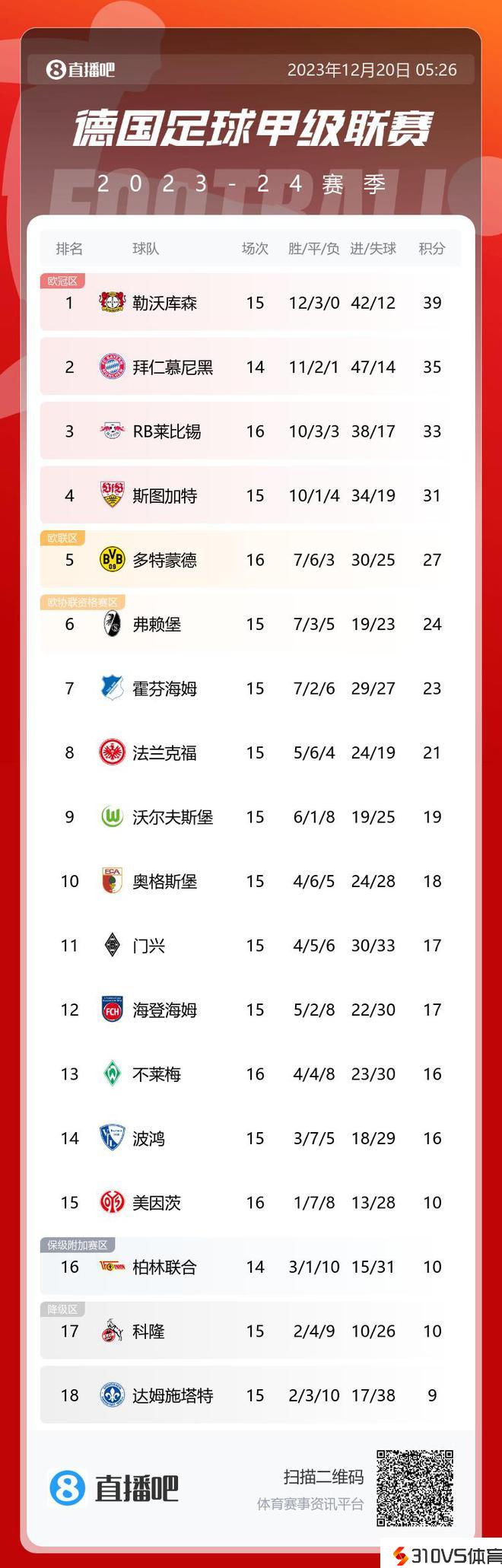 德甲积分榜:莱比锡遭逼平少拜仁2分 多特4轮不胜&先赛距前四4分