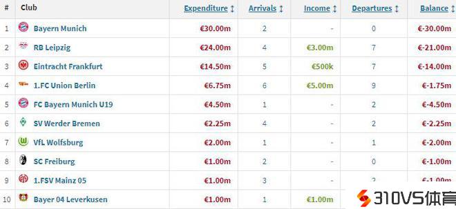 目前,五大联赛的夏季转会市场曾经封锁。德国转会市场网站统计了冬窗支出排名前十的德国球队,其中,拜仁花了3000万欧排在榜首,莱比锡紧随其后,争冠抢手勒沃库森仅破费100万欧排在第十。