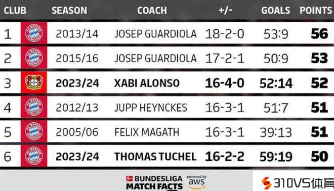 3.勒沃库森(2023-24赛季,主帅阿隆索,16胜4平,进52球丢14球,积52分)