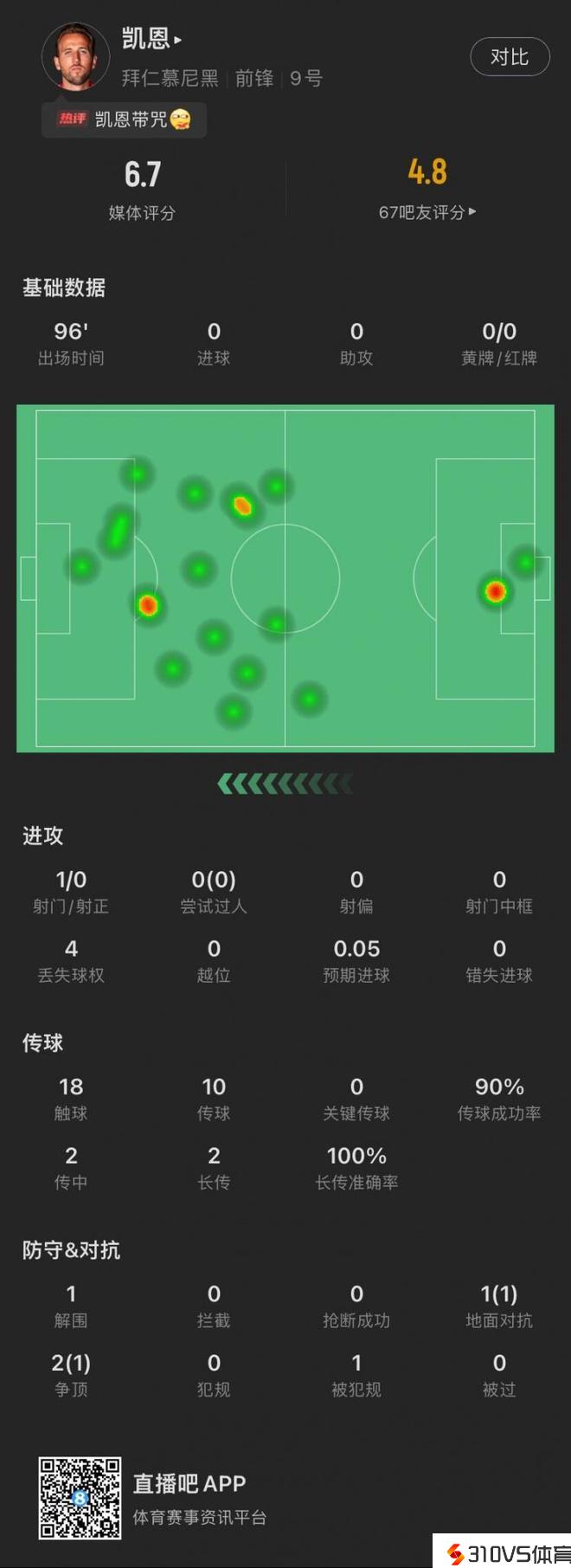 孤掌难鸣凯恩数据:触球18次,仅1次射门0射正,贡献1次突围