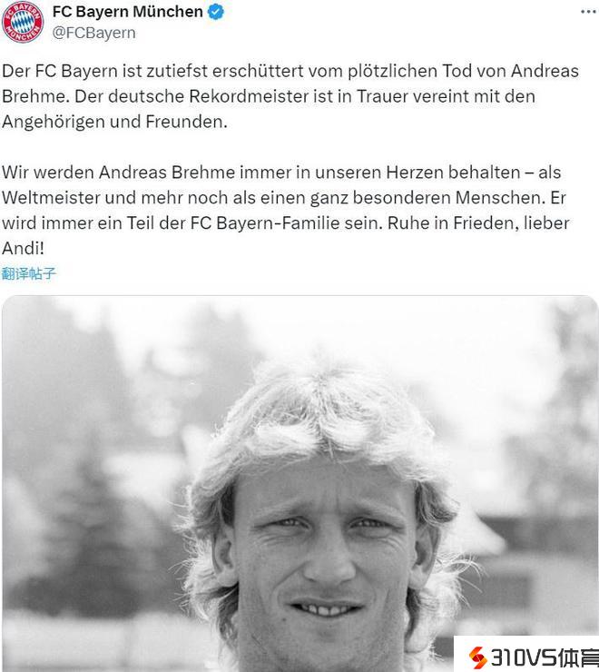 拜仁官方哀悼布雷默:你永远是拜仁慕尼黑小家庭的一份子