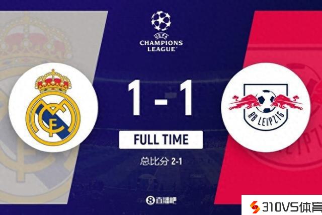 欧冠-皇马1-1总比分2-1莱比锡晋级8强 维尼修斯锁喉推人染黄+破门