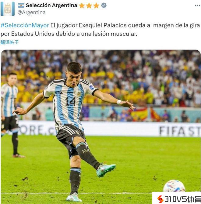 官方:阿根廷中场帕拉西奥斯因肌肉受伤参与国度队