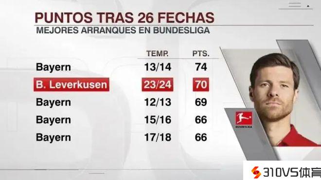 在球队3-2击败弗莱堡后,哈维-阿隆索麾下的勒沃库森在德甲前26轮取得了22胜4平积70分的不败战绩,据ESPN统计,仅低于十年前13/14赛季由瓜迪奥拉治下拜仁发明的24胜2平积74分的纪录。目前,该榜单前五有四席为拜仁创下的纪录,其中瓜迪奥拉和海因克斯各占据两席。