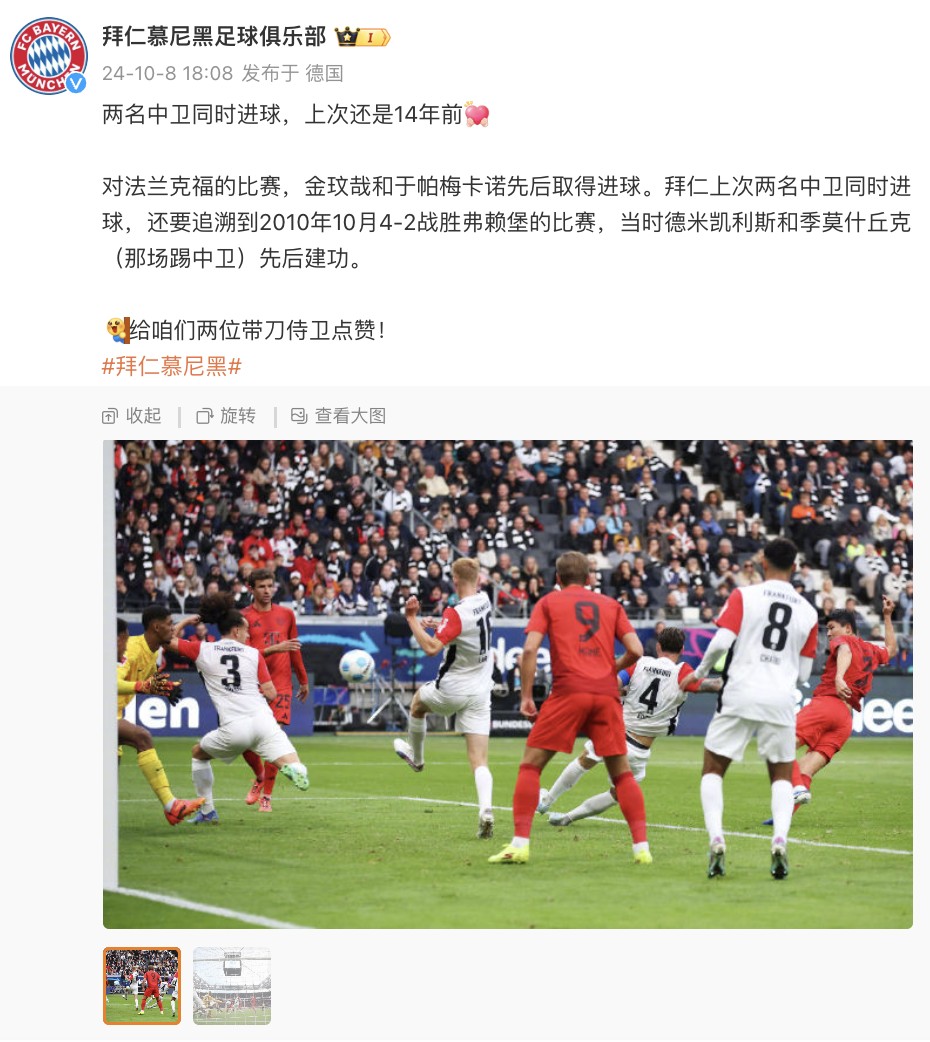 在对阵法兰克福的比赛中,金玟哉和于帕梅卡诺先后取得进球。拜仁上次两名中卫同时进球,还要追溯到2010年10月4-2战胜弗赖堡的比赛,当时德米凯利斯和季莫什丘克(那场踢中卫)先后建功。