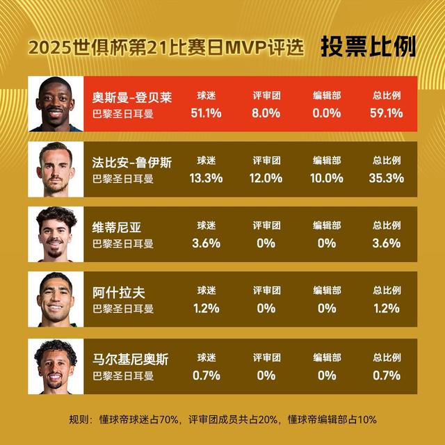 球迷朋友们大家好,欢迎来到懂球帝X咪咕2025世俱杯每日MVP评选。2025世俱杯第21个比赛日MVP得主出炉,今天的半决赛中,巴黎大胜皇马,也让今日的评选变成了“队内MVP”评选,最终登贝莱凭借开局1球1助的表现获评今日世俱杯MVP!