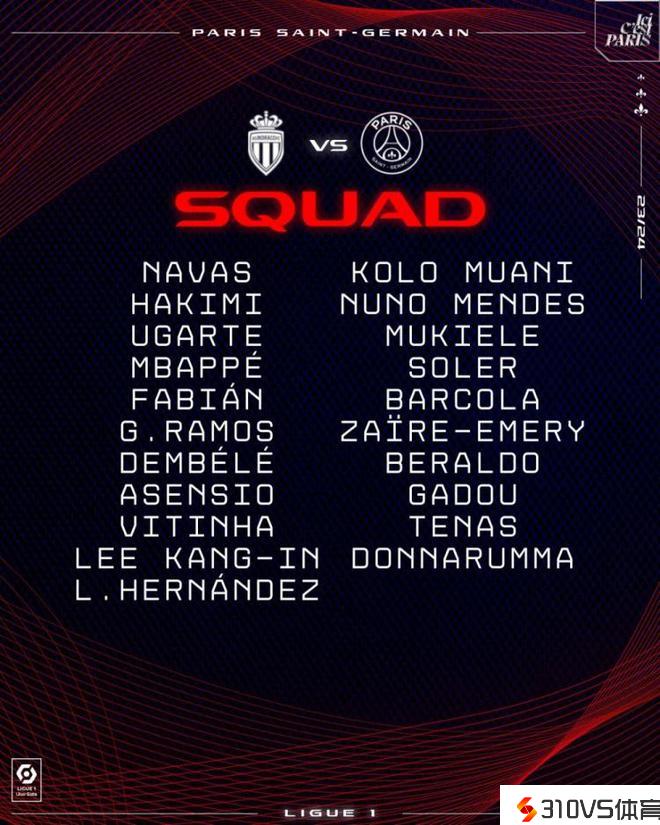 巴黎客战摩纳哥名单:姆巴佩领衔,李刚仁、登贝莱、阿什拉夫在列