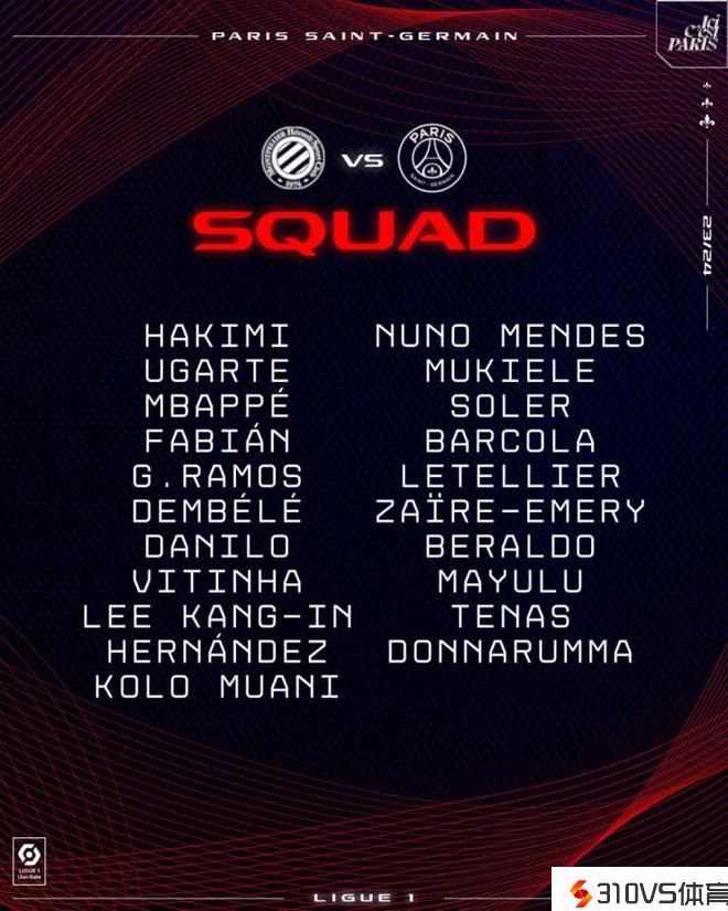 巴黎客战蒙彼利埃大名单:姆巴佩、登贝莱领衔,什克继续伤缺