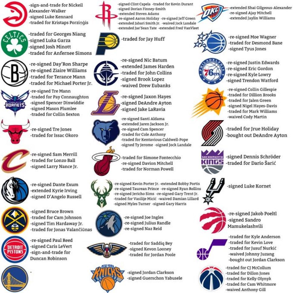 北京时间今日,美媒NBA Memes晒图总结了截至目前NBA各队在自由市场中的操作。值得一提的是,勇士队是目前所有球队中唯一一支没有任何交易签约的球队。