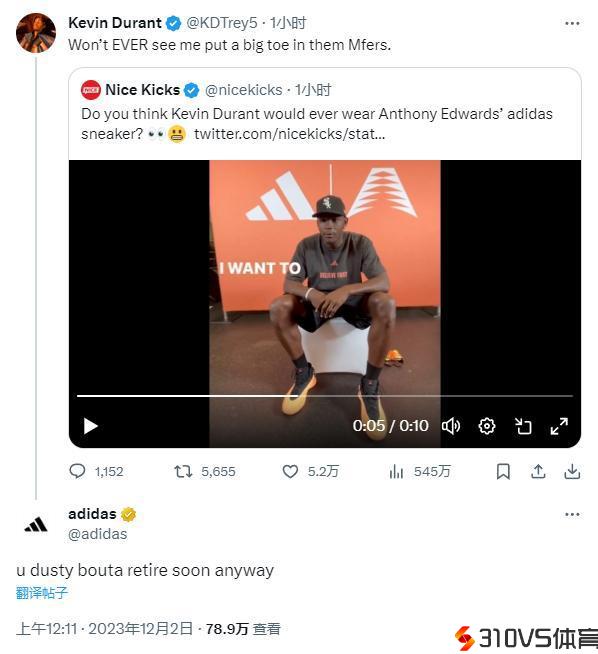 KD断然拒绝穿华子签名鞋 阿迪官推怒喷:你很快就要退役了