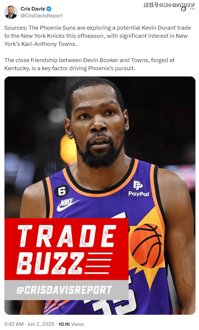 根据纽约记者克里斯-戴维斯的报道,有消息人士透露,菲尼克斯太阳探索休赛期交易杜兰特到纽约尼克斯的可能性,凤凰城对纽约的唐斯感兴趣,布克与唐斯在肯塔基大学时期结下了深厚的友谊,这是太阳推动交易的关键因素。