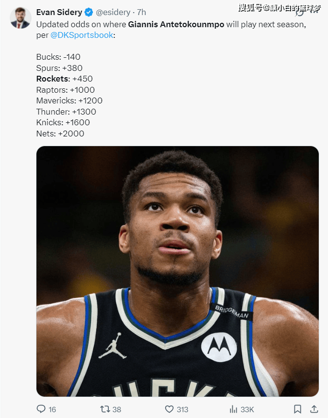 北京时间6月3日,DKS更新了扬尼斯-阿德托昆博的下家赔率:雄鹿-140、马刺+380、火箭+450、猛龙+1000。猛龙这支球队异军突起升至第四,因为近期ESPN透露乌杰里希望在今夏收获一条“大鱼”,很多人猜测是字母哥或杜兰特。