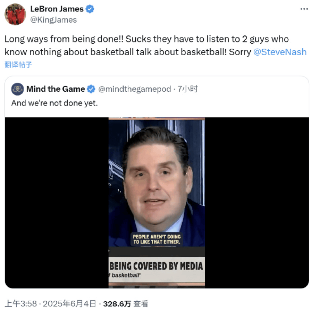詹姆斯今天转发了该视频,发推反讽道:“这件事我们还要做很久很久!很遗憾,你们要听两个不懂球的男人聊篮球!对不起啦!”