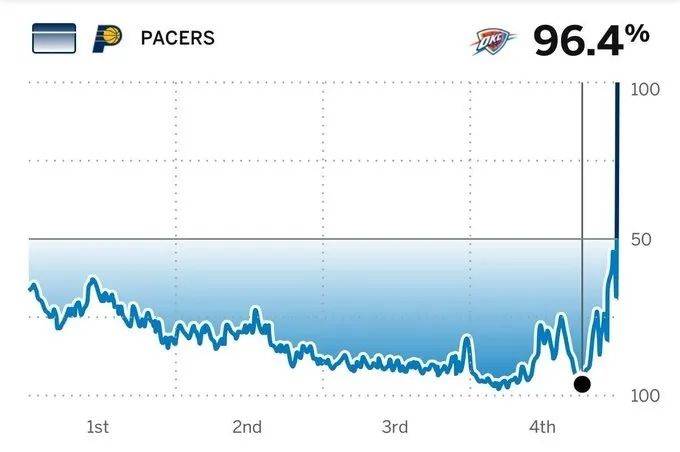 要知道,这场比赛,雷霆最大领先15分,取胜概率一度高达96.4%!但最终还是被哈利的魔法击败。