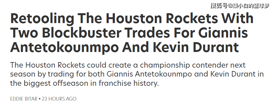 FW的标题《休斯顿火箭队可能会在休赛期以两笔重磅交易引入KD与扬尼斯,火箭可以组建NBA历史上最强悍的三巨头》。