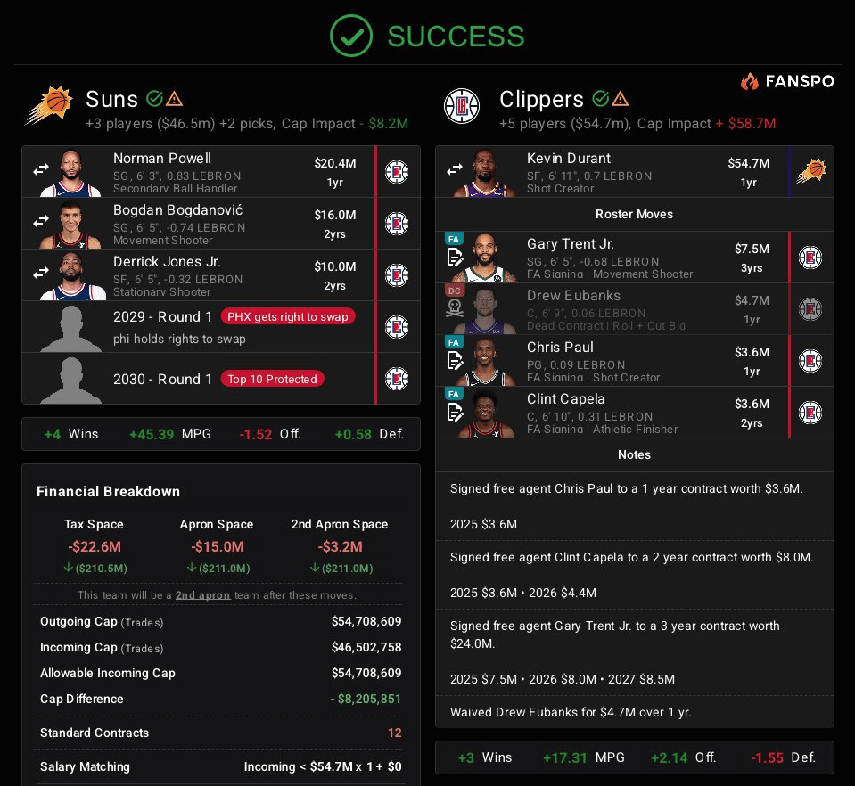 与此同时,美国媒体模拟出一笔 5 换 1 的交易方案,引发球迷热议。按照这个方案,快船队送出诺曼・鲍威尔、德里克・琼斯、博格丹・博格达诺维奇,外加 2029 年首轮互换权以及 2030 年首轮前十顺位保护签,从太阳队交易得到杜兰特。