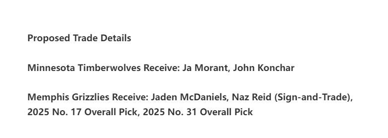 灰熊队:得到贾登・麦克丹尼尔斯、纳兹・里德(先签后换),以及 2025 年的 17 号和 31 号顺位选秀权 ;