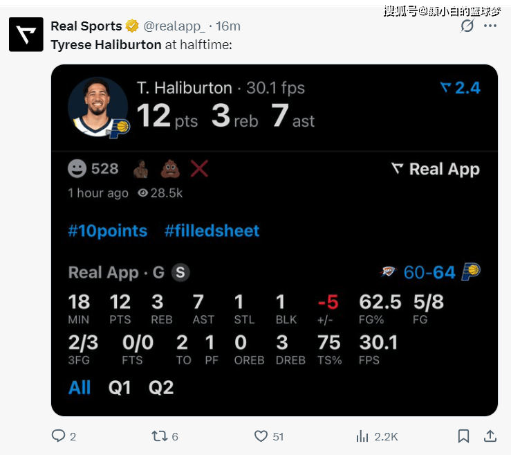 而且哈利伯顿上半场18分钟,8中5+三分3中2,拿到12分3篮板7助攻1抢断1盖帽2失误,命中率62.5%,哈利伯顿效率也很高,不过他在场时步行者-5分。