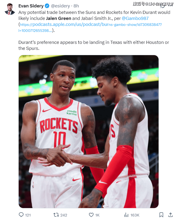 火箭记者克里斯-格瑞曼在播客节目中与休媒Utility Sports谈到关于杜兰特的交易流言时,他们依旧觉得小贾巴里-史密斯与杰伦-格林不该出现在这笔交易谈判中,因为杜兰特是一名即将年满37岁的老将。他们更是表态火箭不会为了杜兰特牺牲多个首轮签,交易来KD也只是为了得到他的到期合同在明夏减税。