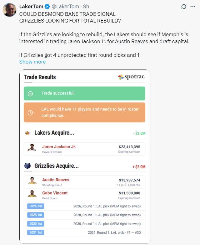 美记盼灰熊推倒重建!湖媒建议6换1小贾伦:1首轮+3首轮互换组3巨