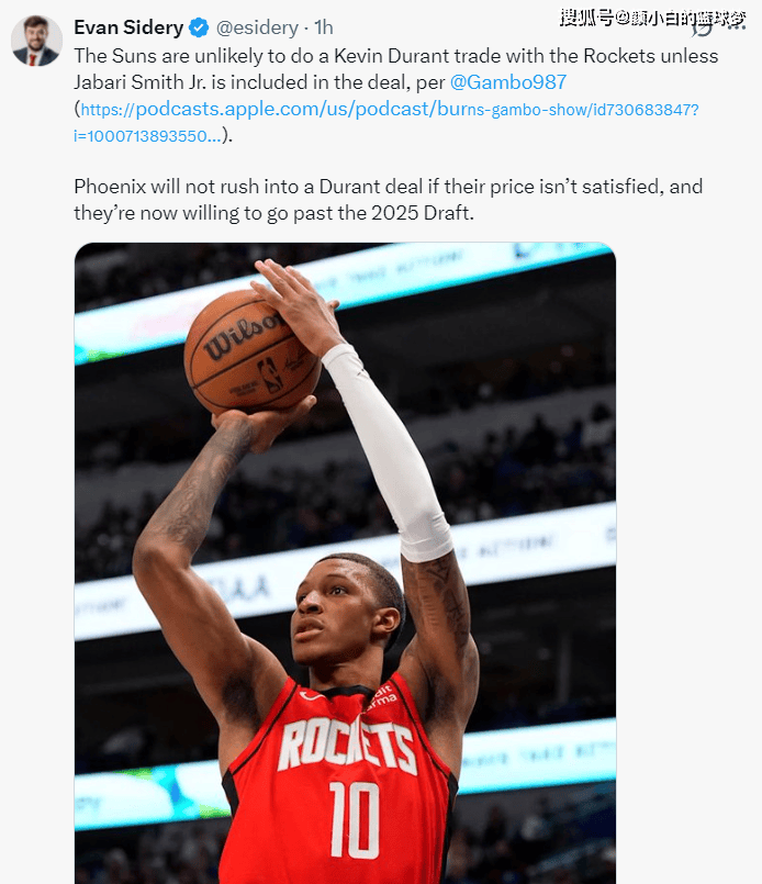 随后《福布斯体育》记者埃文-斯迪瑞透露,太阳不太可能接受火箭队的报价,除非他们在这笔交易中纳入更多的交易资产比如小贾,如果太阳对KD的报价不满意,交易不会贸然进行,他们已经准备将交易的时间延续到2025年选秀大会之后。
