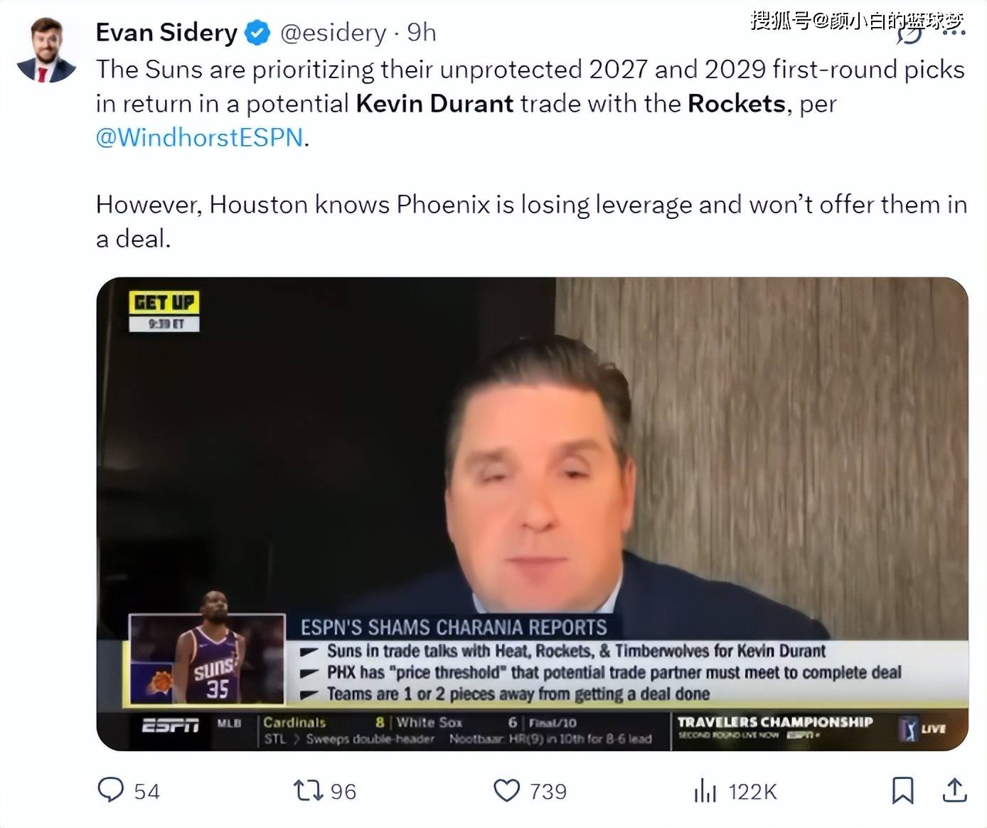 ESPN记者布莱恩-文霍斯特在播客节目中说道:在火箭/太阳关于凯文-杜兰特的潜在交易中,太阳队希望拿回他们2027年与2029年首轮选秀权(没有一定要2025年10号签),然而休斯顿清楚菲尼克斯在这方面诉求占据主动,因此火箭管理层不会在交易中做出让步。