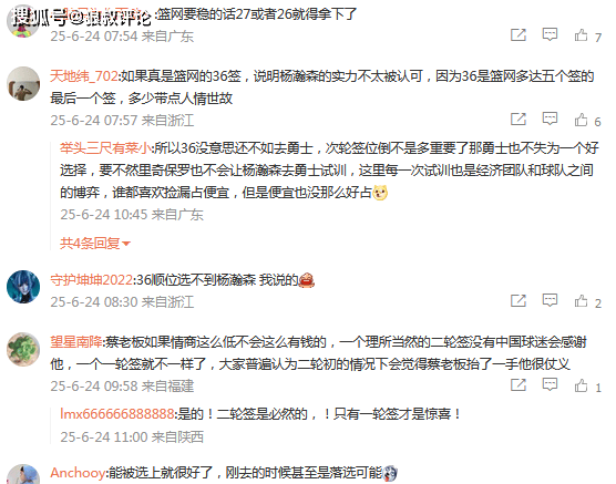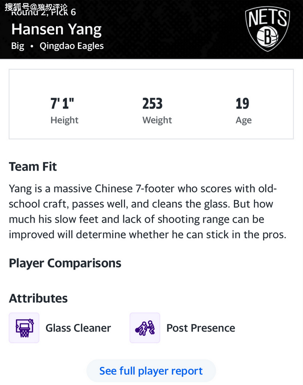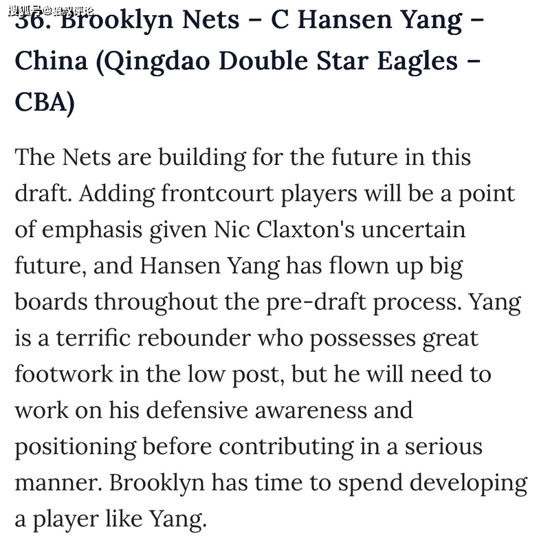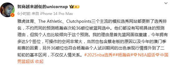 媒体人王健发文点评说道:雅虎体育、The Athletic、Clutchpoints三个主流的模拟选秀网站都更新了选秀排名,不约而同的预测杨瀚森次轮36顺位被篮网选中。他们都没有写明具体的预测理由,但我个人也比较倾向于这个预测。