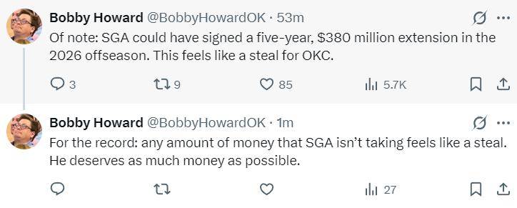雷霆记者鲍比-霍华德写道:雷霆以四年2.85亿提前续约SGA已经算超值续约,因为明年夏天SGA有资格与雷霆提前续约一份五年3.8亿的超级顶薪,均薪高达7600万美元,等于SGA未来每一年都少赚了至少500万美元。