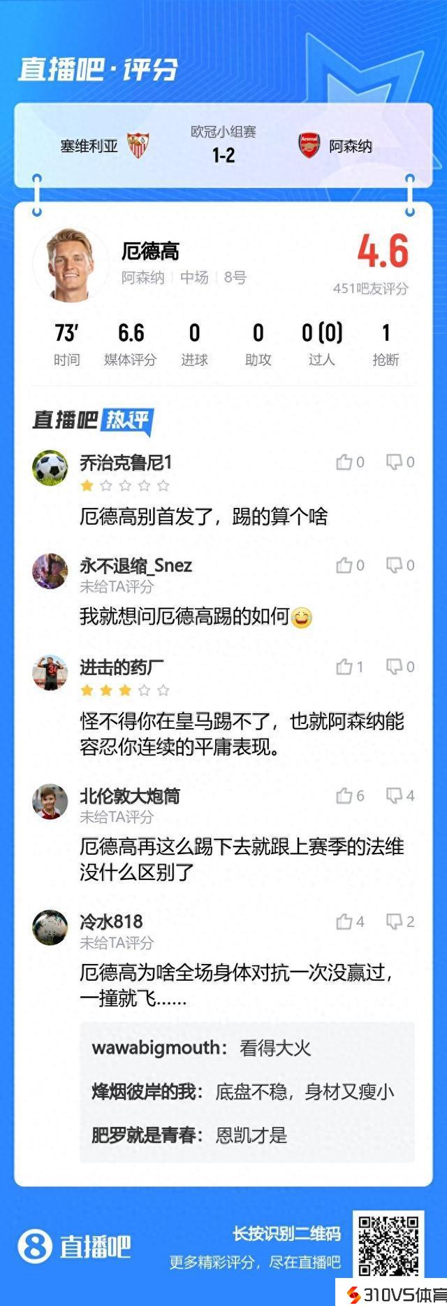 蹩脚!吧友为厄德高打出4.6分:对立一次没赢过 别首发了 踢的啥