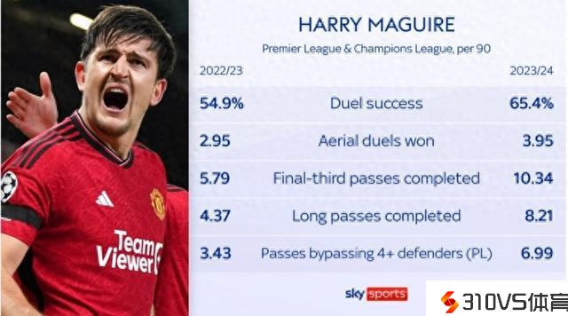马奎尔近两个赛季数据对比:对立成功率&传球要挟性等均有提升