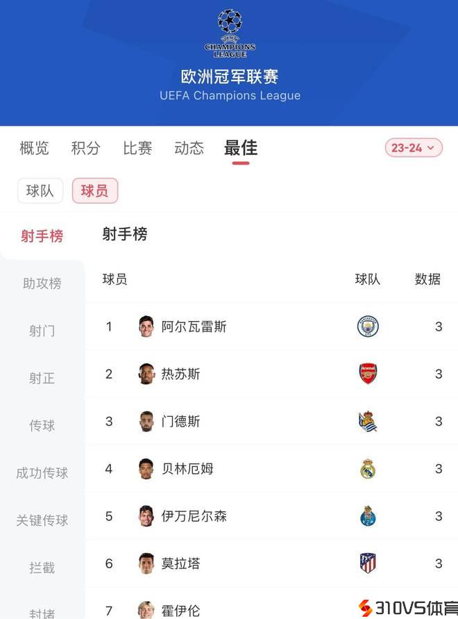 欧冠射手榜:阿尔瓦雷斯、贝林厄姆等7人并列第一