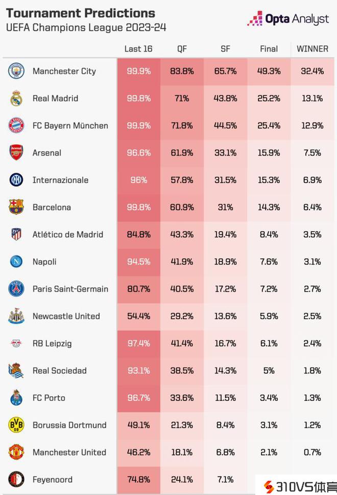 OPTA预测欧冠:曼城夺冠概率32.4%第一,阿森纳第四,曼联0.7%