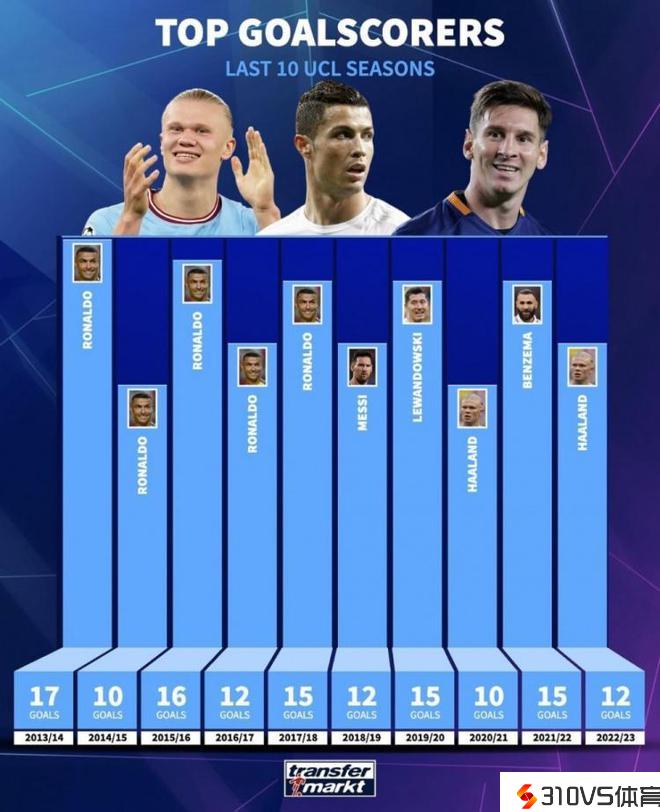 德转清点欧冠近10个赛季金靴奖:C罗五连庄,梅西、哈兰德在列