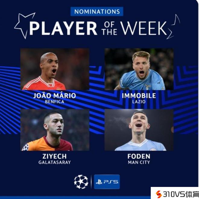 欧冠官方本轮最佳球员候选:福登&齐耶赫&因莫比莱&马里奥