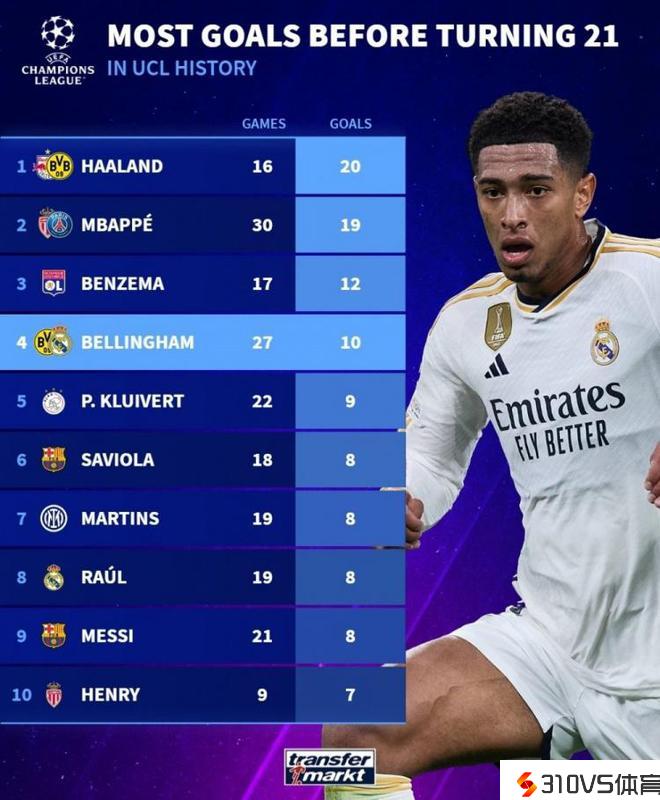 欧冠历史21岁行进球榜:哈兰德20球居首,姆巴佩&贝林厄姆在列