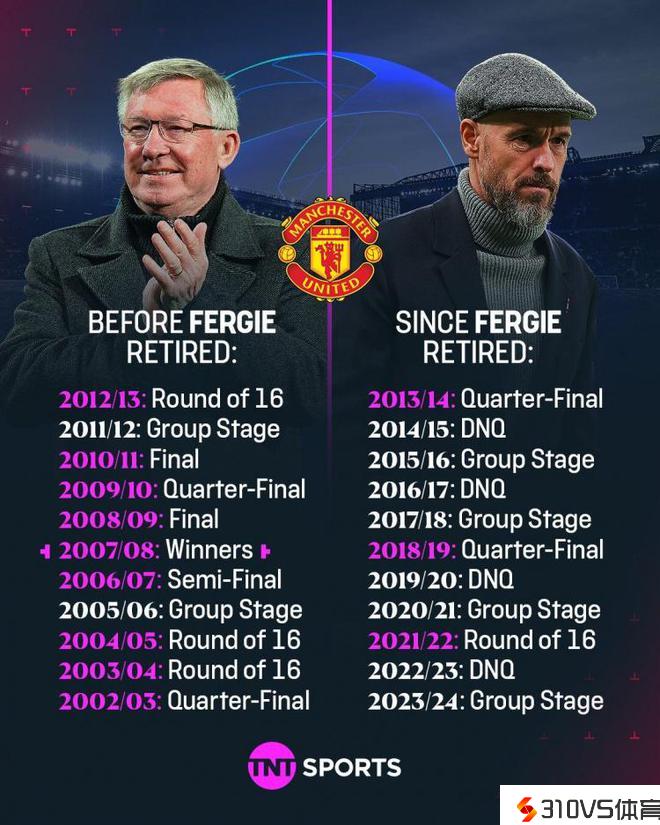 弗格森退休前10年曼联仅2次欧冠小组出局,退休后已4次小组出局