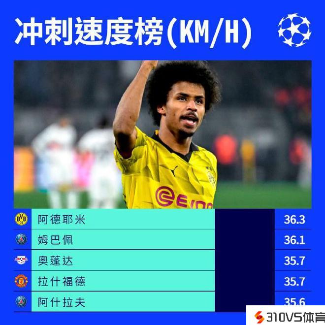 欧冠小组赛冲刺速度榜:阿德耶米居首,姆巴佩、拉什福德在列