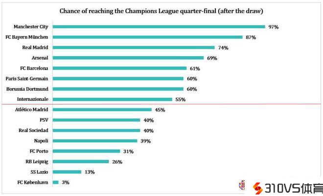 数据机构预测欧冠晋级概率:曼城97%,巴萨61%,那不勒斯39%