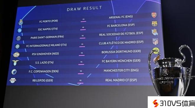 本赛季欧冠1/8决赛抽签对决为:阿森纳VS波尔图、巴塞罗那VS那不勒斯、皇家社会VS巴黎圣日耳曼、马德里竞技VS国际米兰、多特蒙德VS埃因霍恩、拜仁慕尼黑VS拉齐奥、曼城VS哥本哈根、皇家马德里VSRB莱比锡。