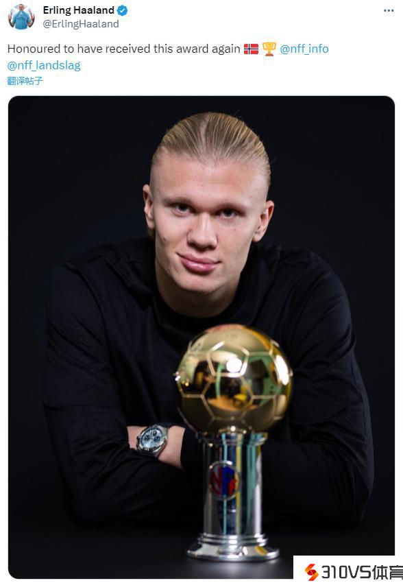 哈兰德社媒晒挪威金球奖:很荣幸再次取得这一奖项