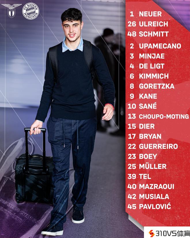 拜仁欧冠客战拉齐奥大名单:凯恩领衔,博埃、萨拉戈萨在列