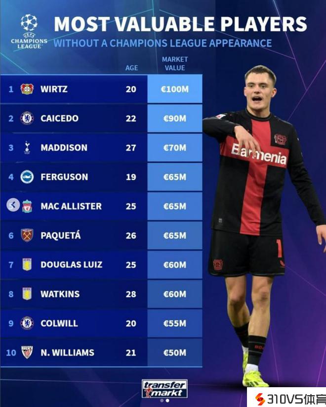 德转列还不曾出战欧冠球员身价榜:维尔茨1亿欧居首,凯塞屡次席